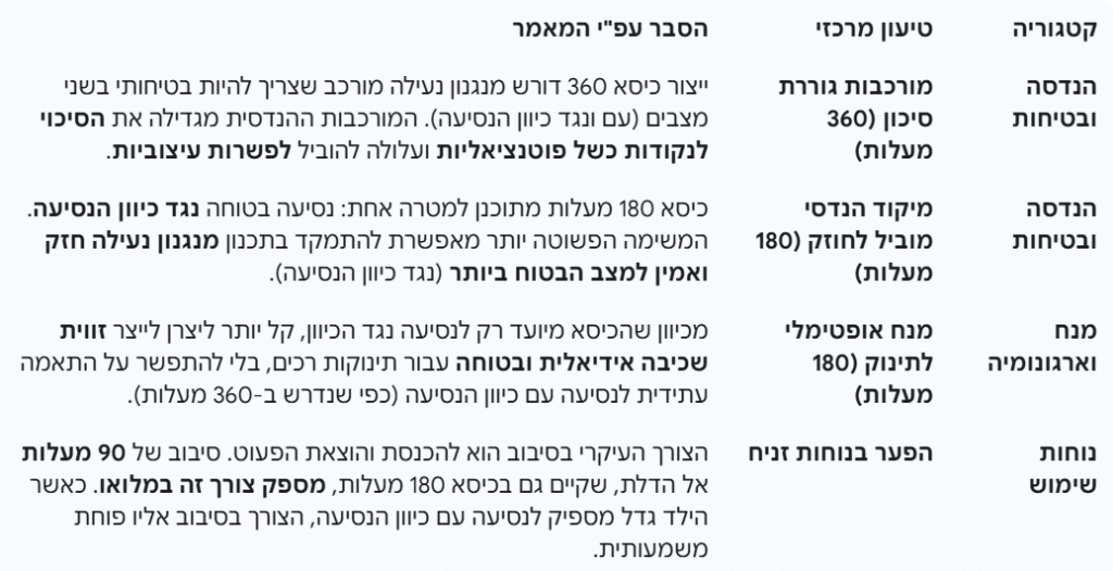 חשוב להדגיש: הניתוח הבא אינו מתבסס על מחקר ספציפי שהוכיח עליונות של סוג אחד על פני השני, אלא נשען על היגיון הנדסי ועקרונות בטיחות בסיסיים. הוא מציע זווית חשיבה נוספת, לפיה דווקא כיסא המסתובב 180 מעלות (כלומר, מאפשר סיבוב אל הדלת וננעל באופן בטיחותי אך ורק במצב של נסיעה נגד הכיוון) עשוי להיות בחירה חכמה יותר.